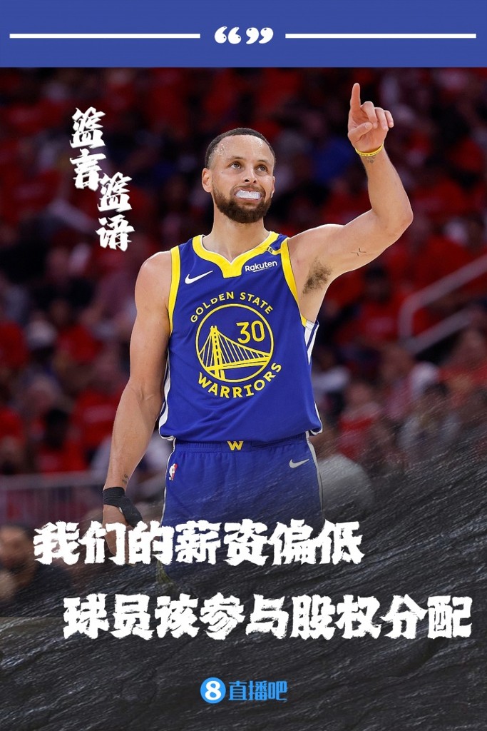 库里:“我认为因为目前的劳资协议的结构,我们无法参与股权分配。嗯,这很重要,因为这是与球队老板、与联盟之间的一种合作关系,而我们在收入方面处于劣势,对吧?那些数字听起来可能很惊人,但不管你拿哪个时期和现在比,联盟在做的事情可能都增长了10倍左右。所以,我之所以说我们薪资偏低,部分原因是在打球期间无法参与股权分配。毕竟你肯定希望能从这种增长中分一杯羹。”