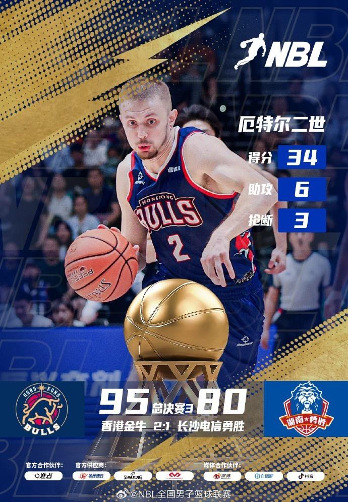 比赛开始,长沙勇胜上来就打得很主动,达卡里-约翰逊内线连续造杀伤单节轰下13分,长沙勇胜迅速建立主动权,香港金牛外线一球不开,首节长沙勇胜领先12分,次节厄特尔三分终于开和带领香港金牛9-2追近比分,达卡里内线依然难防,双方展开拉锯战,还是厄特尔连续取分助香港金牛半场追到仅差1分。下半场,香港金牛上来就反超比分,厄特尔继续保持外线手感,但威尔斯连续三分能回应,达卡里连续二次进攻再次取得领先,董健连续三分反超2分,末节孙晨然和董健又是接连三分命中,香港金牛13-4小高潮拉开双位数领先,长沙勇胜进攻断电半节仅得6分,厄特尔三分再进拉开17分领先,最终香港金牛95-80逆转长沙勇胜,总比分2-1拿到冠军点。