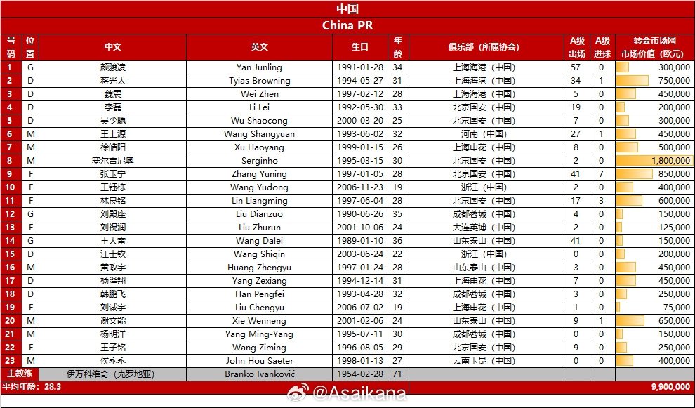 附国足vs巴林队名单: