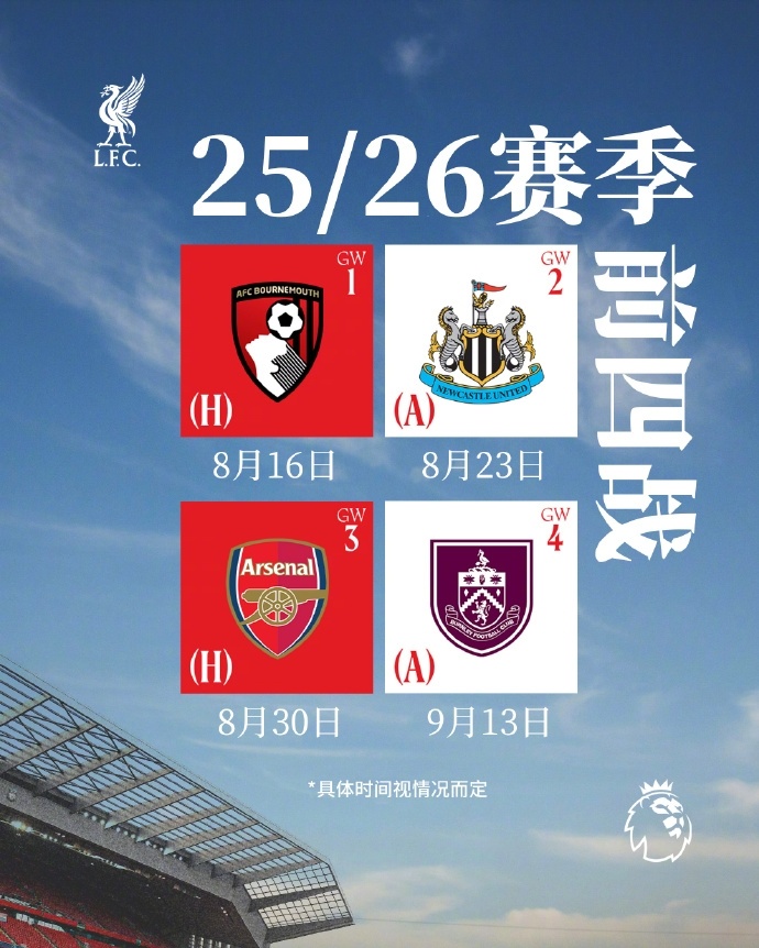 06月18日讯 25/26赛季英超赛程出炉,利物浦揭幕战对手是伯恩茅斯,比赛将于北京时间8月16日周六3:00进行,红军坐镇安菲尔德开启新赛季!