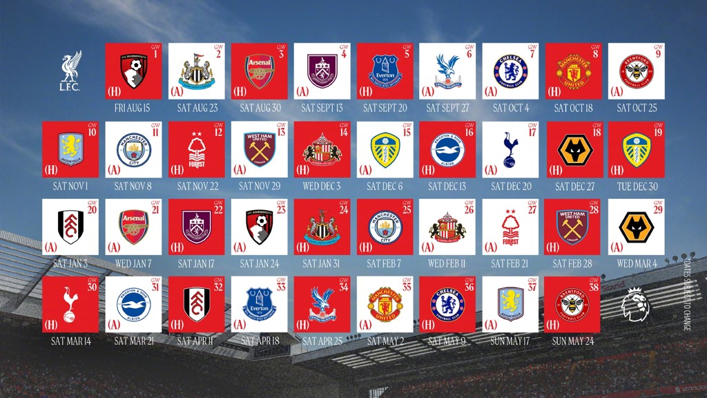 第1轮,2025年8月16日,利物浦 v 伯恩茅斯(3:00,揭幕战)