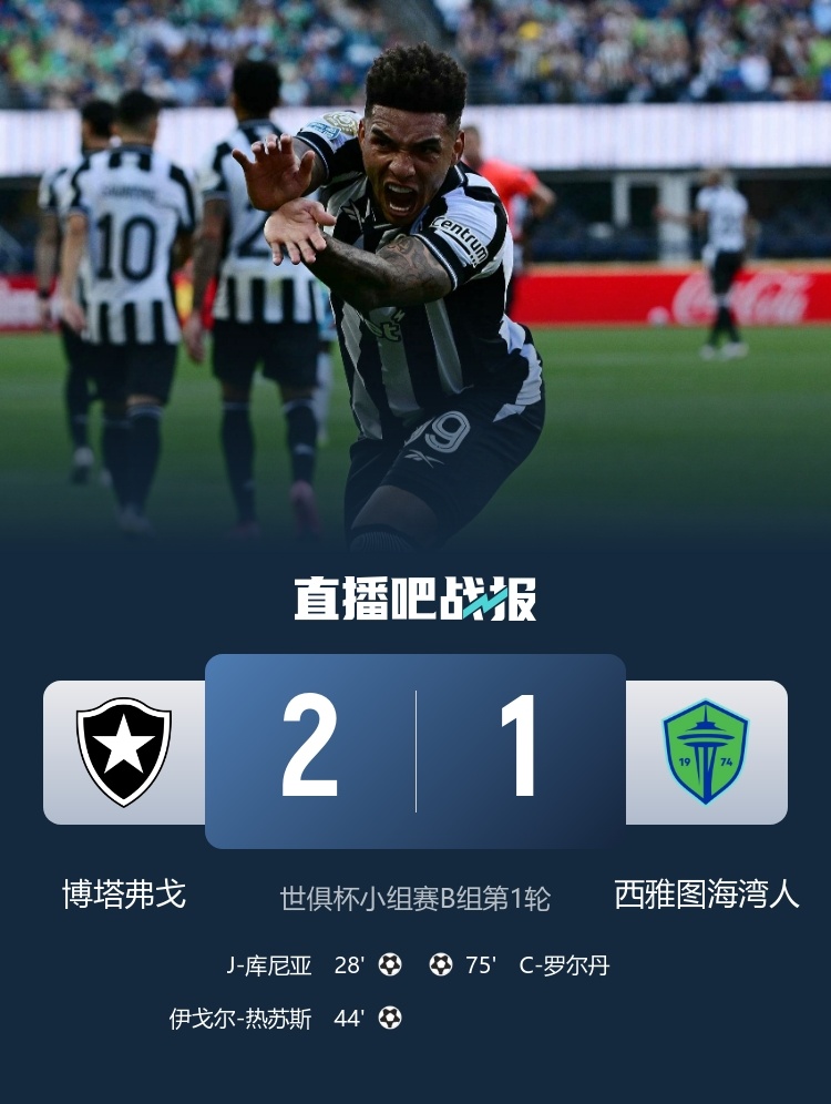 6月16日讯 北京时间10:00,世俱杯小组赛B组第1轮,博塔弗戈vs西雅图海湾人,比赛在流明球场打响。上半场,特莱斯精确制导,助攻J-库尼亚破门!半场结束前,维蒂尼奥助攻伊戈尔-热苏斯建功。下半场,西雅图错失绝佳机会;C-罗尔丹头球扳回一球。最终,博塔弗戈2-1战胜西雅图海湾人,取得开门红!位列B组第2;西雅图海湾人排名第3。