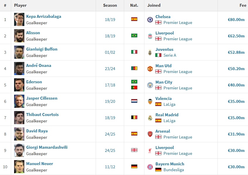 附门将历史转会费前十(单位:欧元):