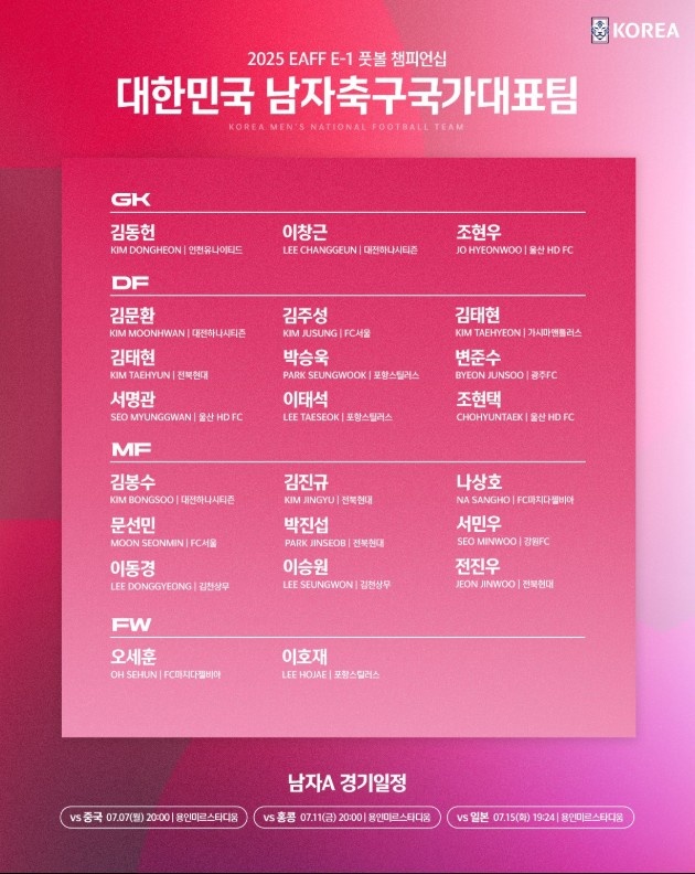 6月23日讯 韩国足协公布韩国男足东亚杯23人名单,这份名单由20位本土联赛球员以及3位J联赛球员组成。根据赛程,东道主韩国男足首战7月7日19点对阵中国男足。