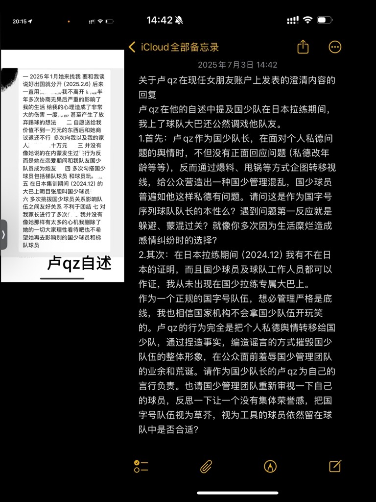 卢琦政的自述中提及国少队在日本拉练期间,我上了球队大巴还公然调戏他队友。卢琦政作为国少队长,在面对个人私德问题的舆情时,采用甩锅方式转移至我。在日本拉练期间(2024.12)我有充足不在日本的证明,我从未出现在国少拉练专属大巴上。