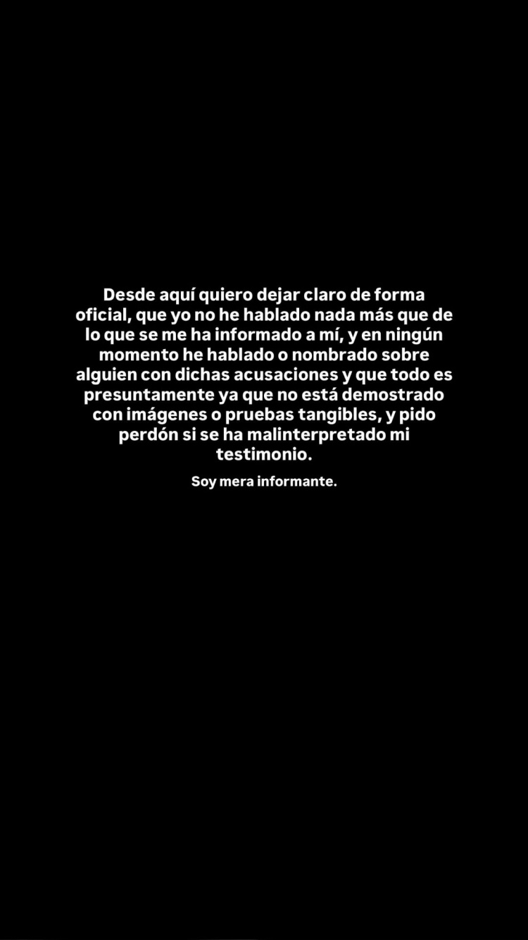 克劳迪娅-卡尔沃社媒发表声明:“在此我要正式澄清,我仅谈及我所获知的信息,从未提及或点名任何涉及这些指控的人,且一切均为推测性质,因为尚未有影像或确凿证据证实。如果我的言论被误解,我深表歉意。我只是信息提供者。”