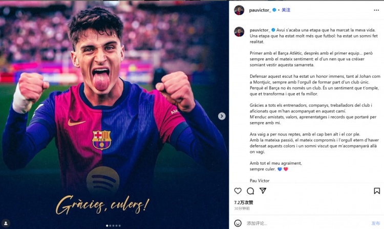 7月26日讯 巴萨官方宣布,23岁前锋保-维克托转会布拉加。保-维克托也通过社媒发文向巴萨告别: