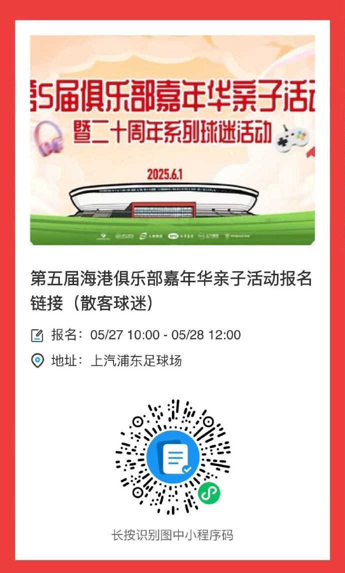 【当六一邂逅端午!上海海港邀您共度佳节】俱乐部将于6月1日举办第5届俱乐部亲子嘉年华活动暨20周年系列球迷活动,邀请海港大家庭的家人们带着小朋友前来一同玩耍!