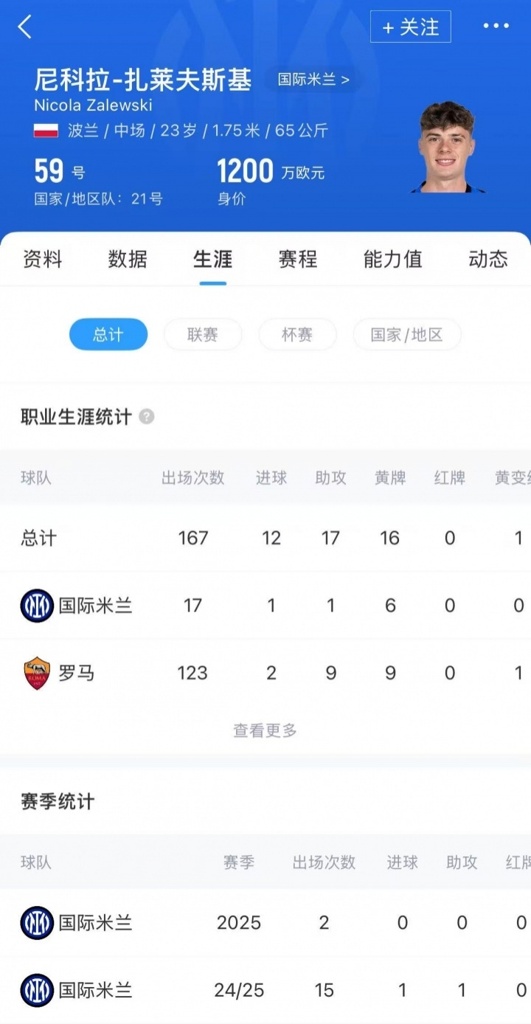 扎莱夫斯基现年23岁,波兰中场,上赛季代表国米各赛事出场15次,贡献1球1助,目前球员德转身价为1200万欧元。