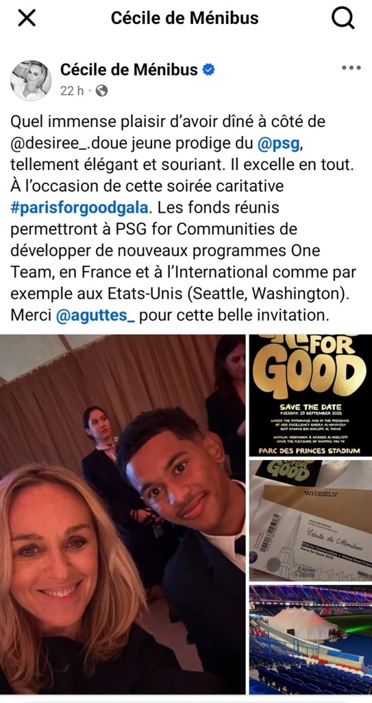 巴黎举行基金会晚宴,梅尼布斯在社媒晒出一张合照,写道:“能与巴黎天才球员@杜埃坐一起共进晚餐,我感到非常荣幸,如此优雅,笑盈盈的,他简直面面俱到。”