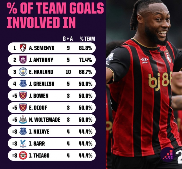 10月8日讯 本赛季,伯恩茅斯边锋塞梅尼奥延续了出色的状态,他在球队进攻中的重要性不言而喻。根据OPTA的数据统计,塞梅尼奥参与进球数占球队总进球数的81.8%,为英超球员最高。
